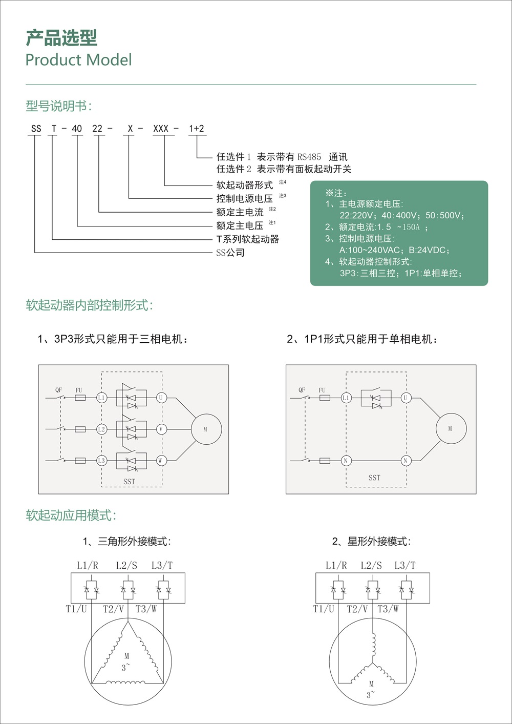 SST-A系列软起动器是一款数字式电机软起动产品,可控制电机在起动过程中平滑加速、停止过程中平滑减速,并提供了针对电动机及产品自身的保护功能。是传统星三角式及自耦降压式起动器的最佳升级替代产品。